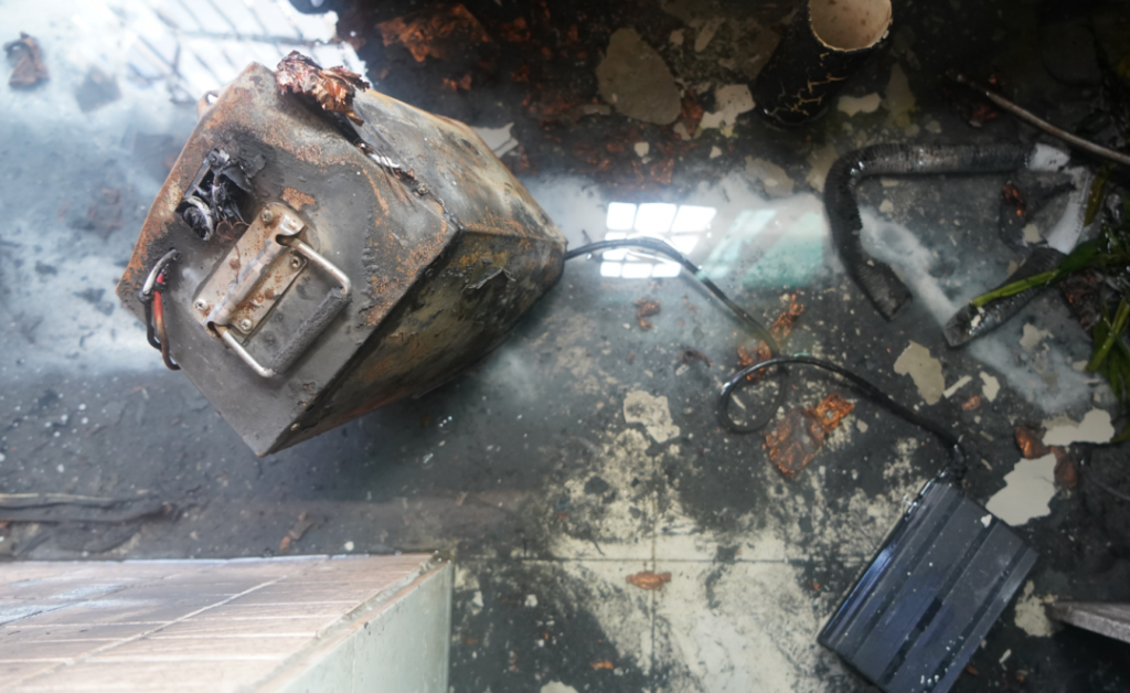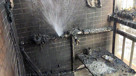電瓶燃燒燒破陽臺pvc水管,水管噴灑出水將火情控制,火勢未進一步擴大。事發(fā)后內部墻體被濃煙嚴重熏黑,現(xiàn)場一片狼藉,所幸未造成人員傷亡。
