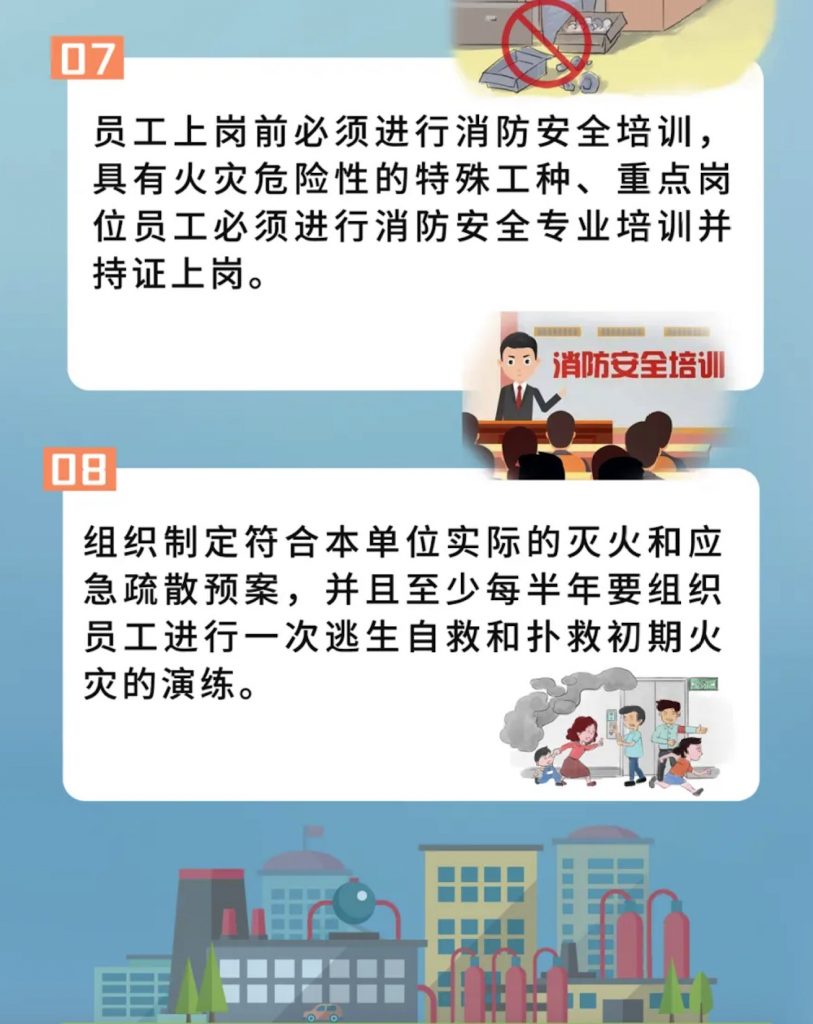 ● 小區(qū)物業(yè)要落實(shí)消防安全主體責(zé)任,保持消防設(shè)施完好,保持“生命通道”暢通,提升物業(yè)工作人員檢查消除火災(zāi)隱患能力、撲救初期起火能力、組織人員疏散逃生能力、實(shí)現(xiàn)救早滅小的目的;
