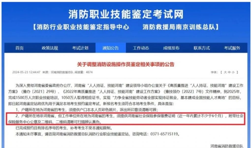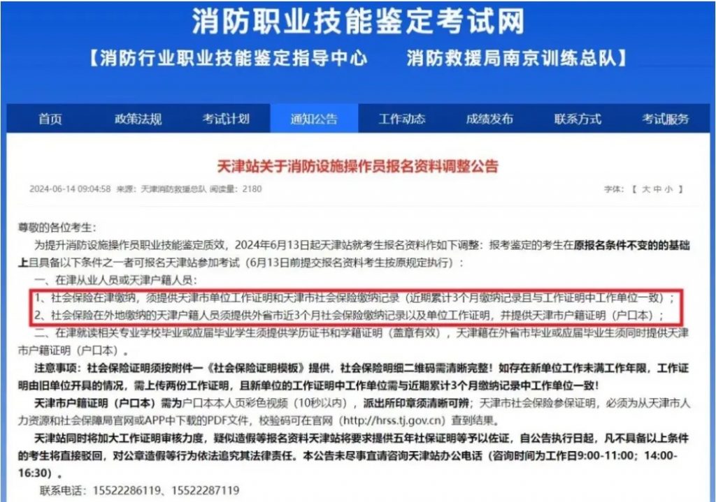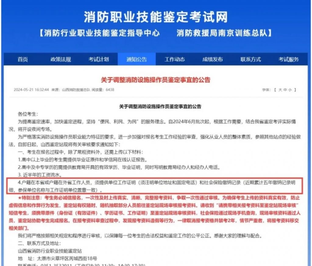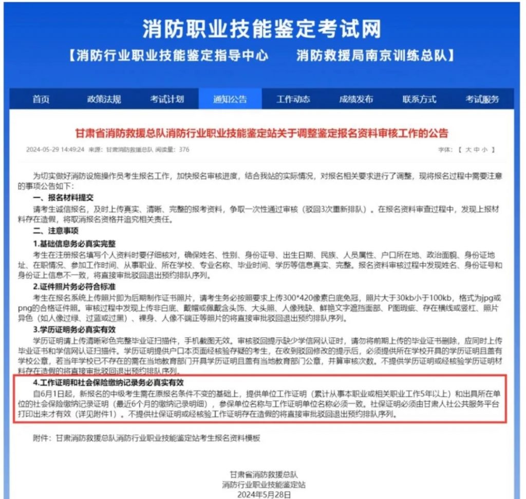 為嚴格落實消防設施操作員職業(yè)能力特征的要求,進一步加強對報名考生工作經(jīng)驗的審查,強化從業(yè)人員的整體素質。自6月1日起,新報名的中級考生需在原報名條件不變的基礎上,提供單位工作證明(累計從事本職業(yè)或相關職業(yè)工作5年以上)和出具所在單位的社會保險繳納記錄證明(最近6個月的繳納記錄明細),參保單位名稱與工作證明單位名稱必須一致。