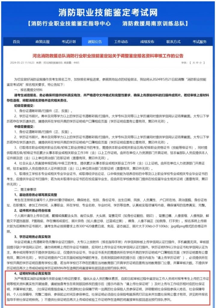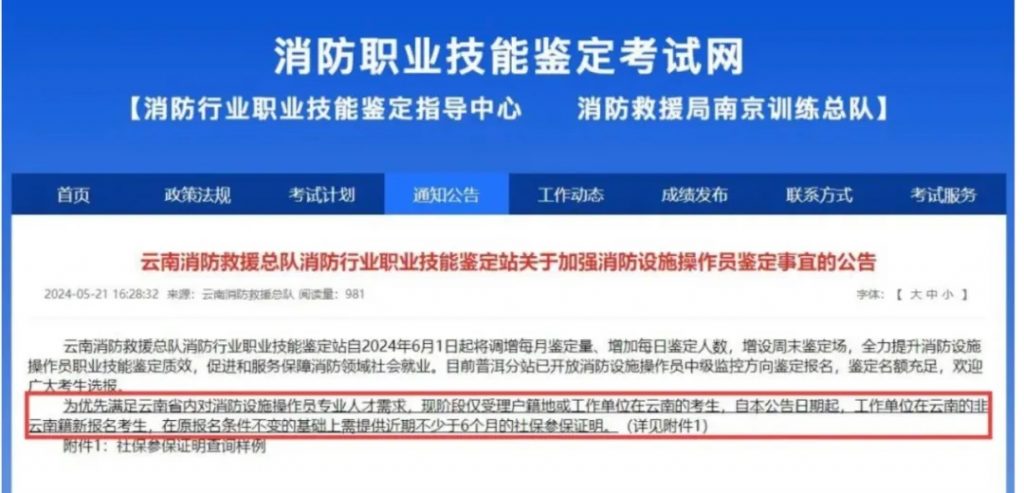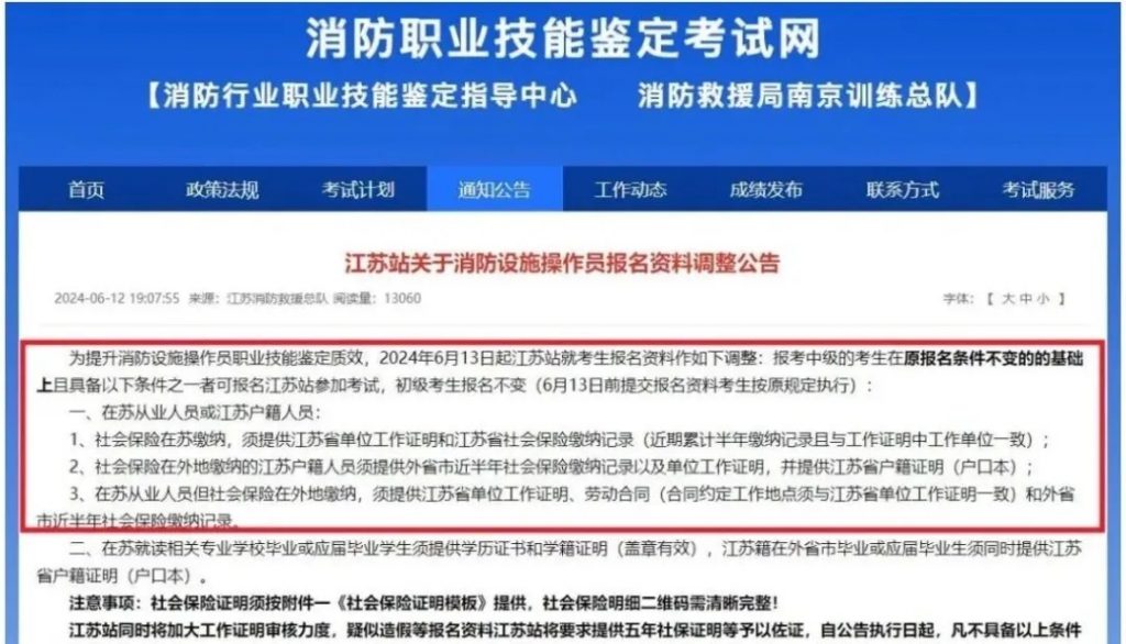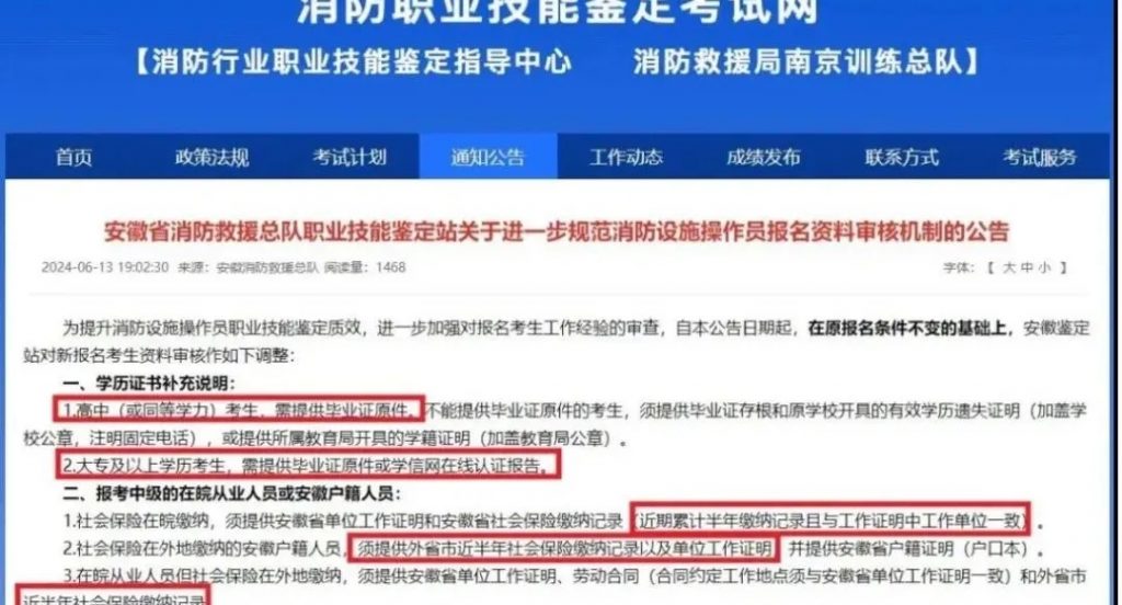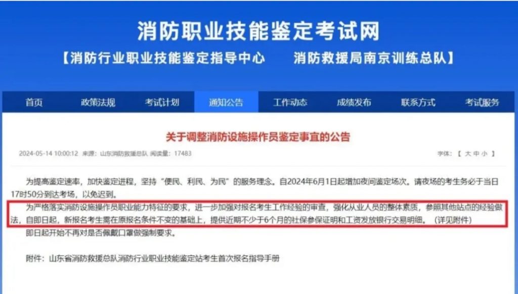 為嚴格落實消防設施操作員職業(yè)能力特征的要求,進一步加強對報名考生工作經(jīng)驗的審查,強化從業(yè)人員的整體素質。自6月1日起,新報名的中級考生需在原報名條件不變的基礎上,提供單位工作證明(累計從事本職業(yè)或相關職業(yè)工作5年以上)和出具所在單位的社會保險繳納記錄證明(最近6個月的繳納記錄明細),參保單位名稱與工作證明單位名稱必須一致。