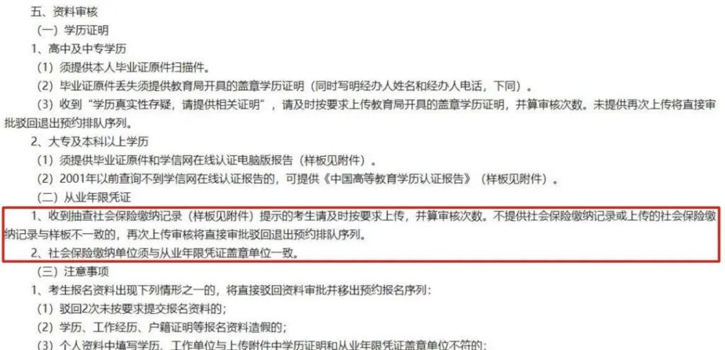 1.收到抽查社會保險繳納記錄(樣板見附件)提示的考生請及時按要求上傳,并算審核次數(shù)。不提供社會保險繳納記錄或上傳的社會保險繳納記錄與樣板不一致的,再次上傳審核將直接審批駁回退出預約排隊序列。