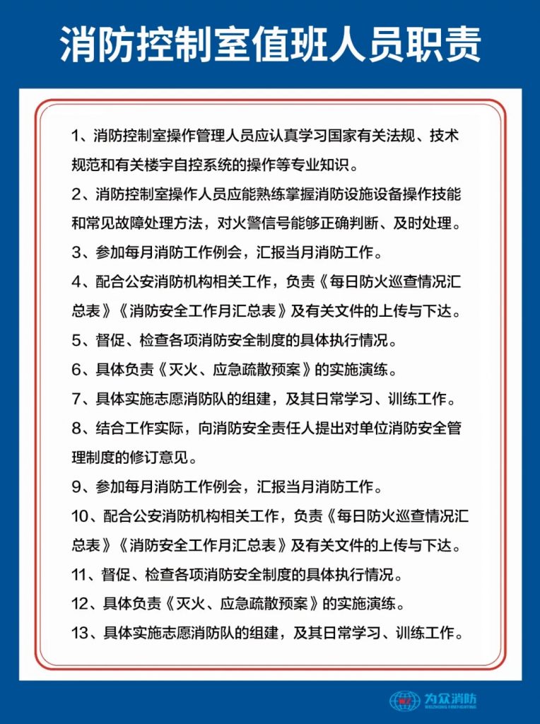 根據(jù)《消防控制室通用技術要求》的規(guī)定,實行每日24 h專人值班制度,每班不應少于2人,值班人員應持有消防控制室操作職業(yè)資格證書。工作時間每班不超過8h。主要工作職責包括以下: